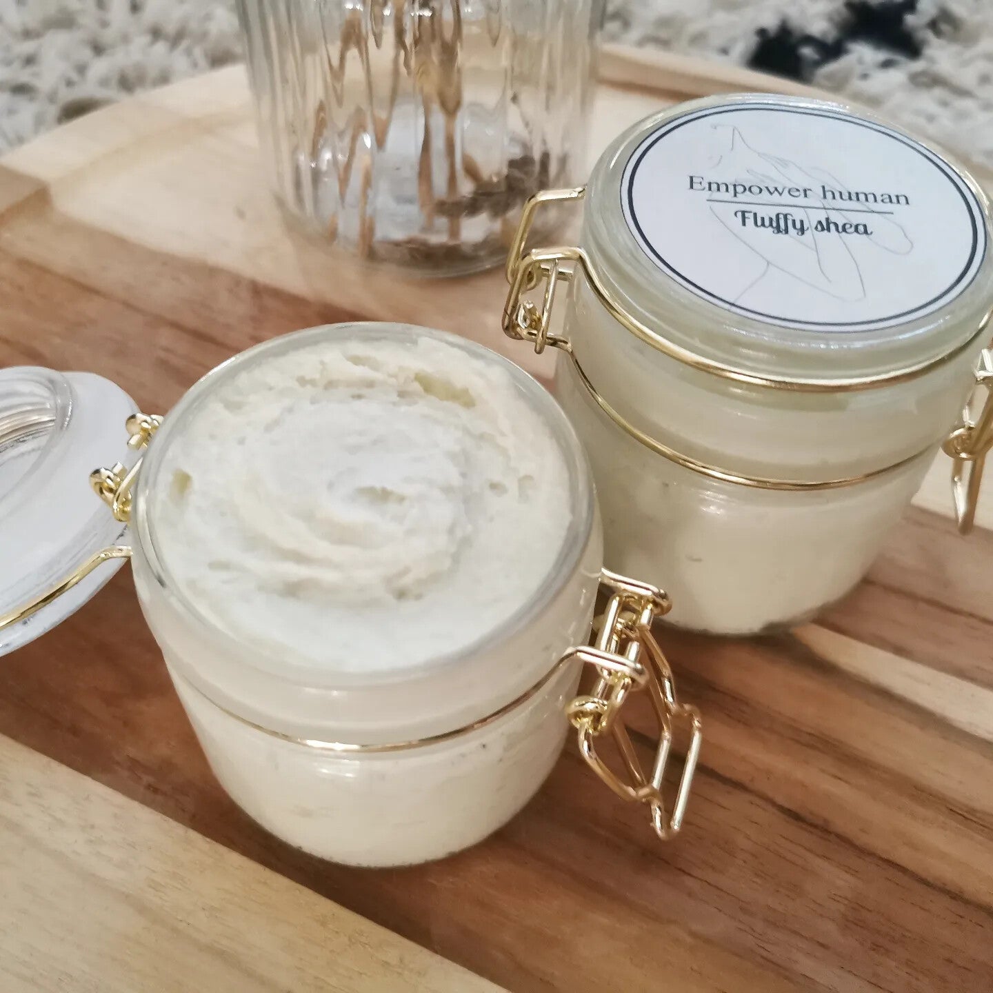 Onze Fluffy shea bestaat namelijk alleen uit shea boter, vitamine E olie & etherische oliën.